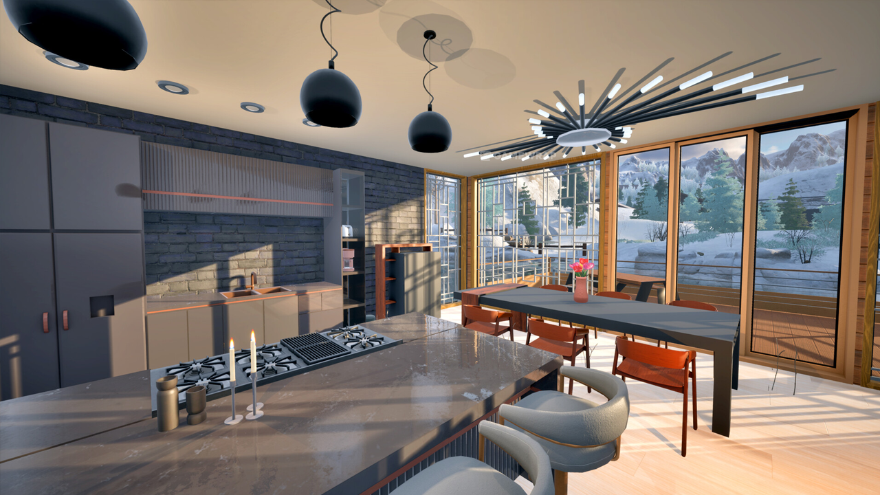 Once the construction phase is complete, explore your home with the first-person view! Change the position of the sun to admire the rooms’ performance in different lights, and admire your creations in sublime rustic, urban, or mountain landscapes.