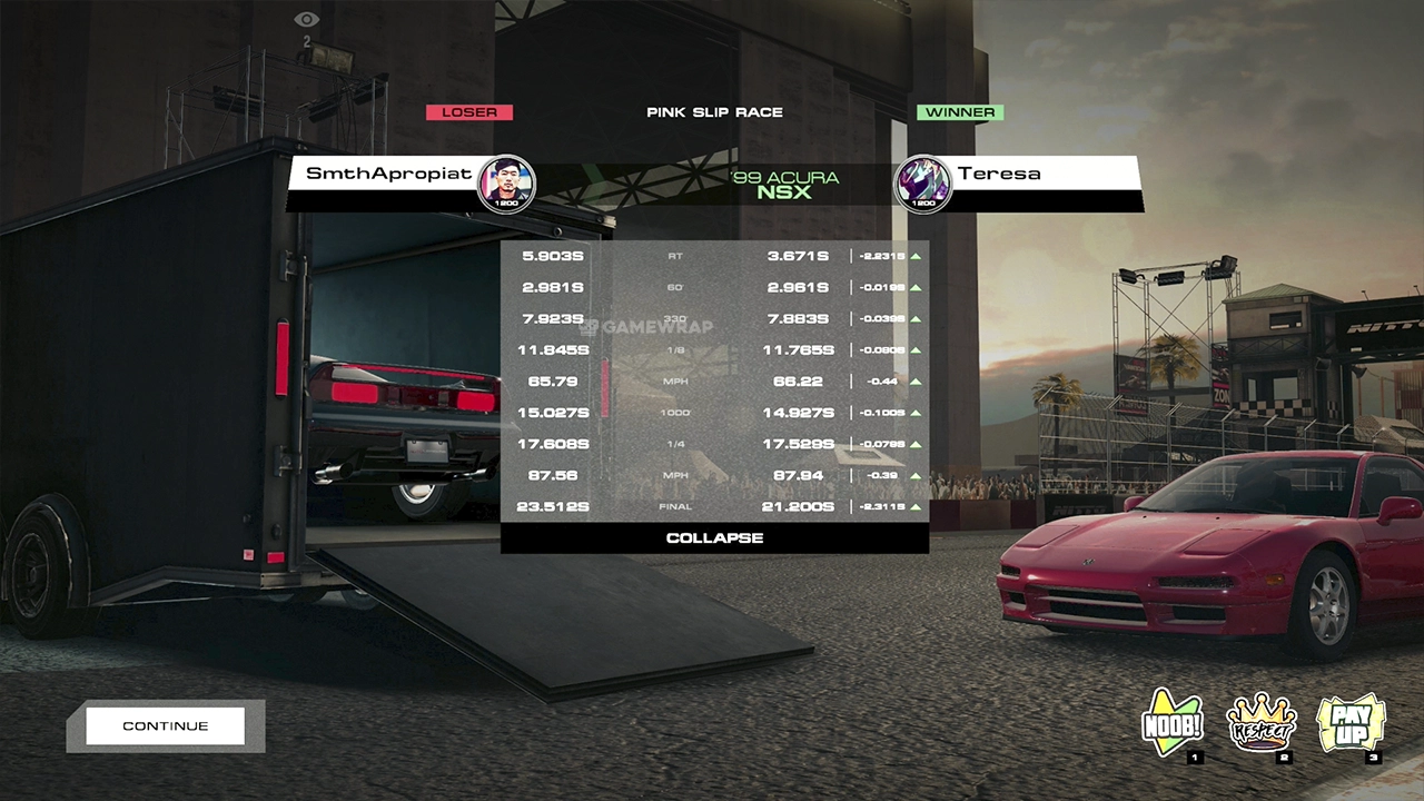 - Detailed post-race stats, from street cred earned to how much wear your car took on.