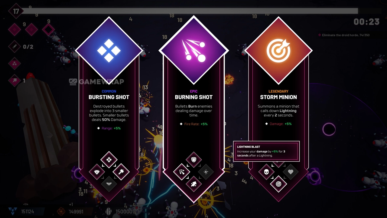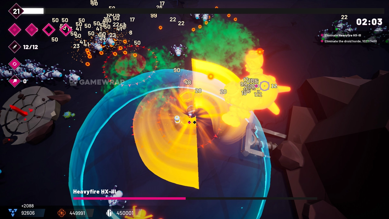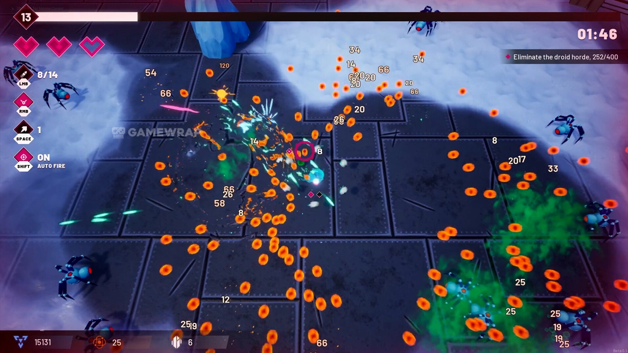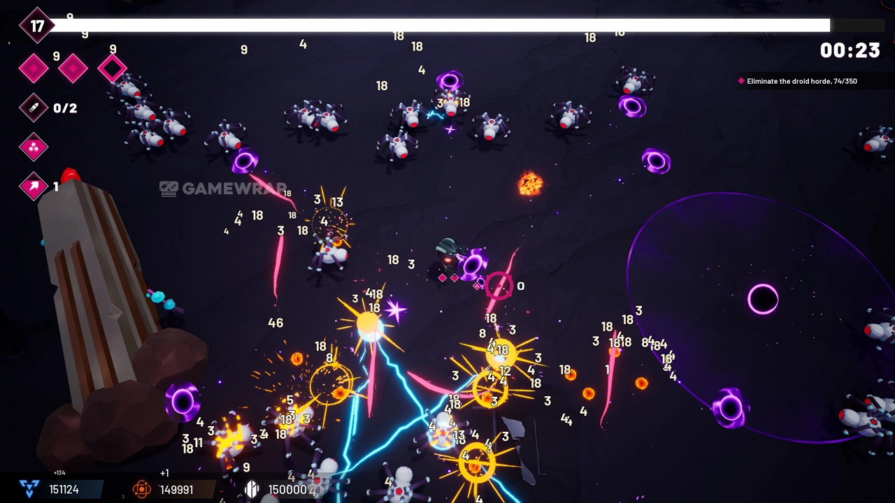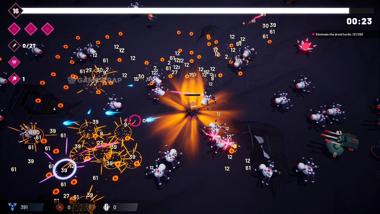 Destroy huge hordes of droids that want to absorb your powerful core and fight bosses with unique patterns!