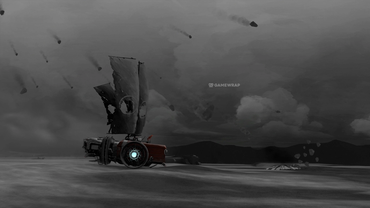 FAR: Lone Sails is a contemplative and minimalistic side-scrolling adventure. The game begins with an unnamed protagonist, a small figure in a red coat, at a gravesite. They then embark on a solitary journey across a desolate, dried-out seabed in a unique, large, land-based vehicle.